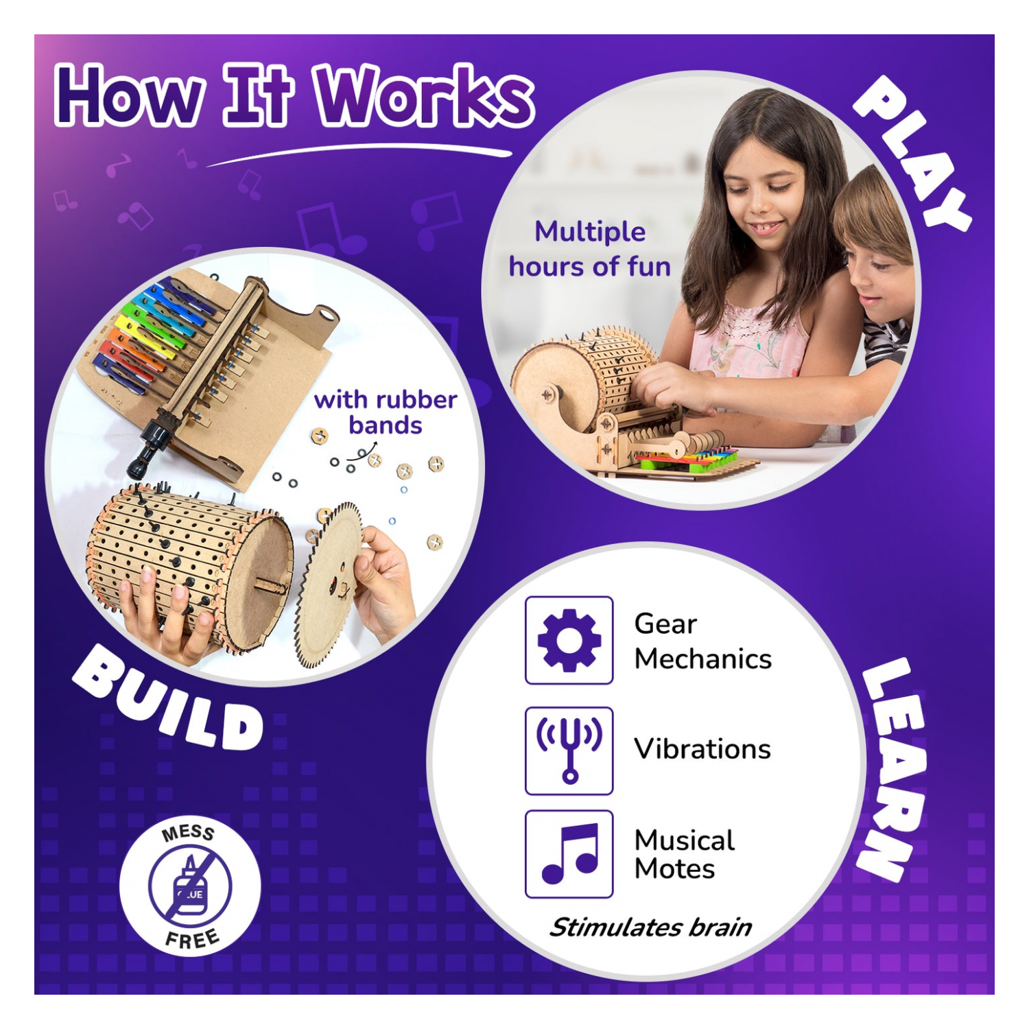 Vermittle deinem Kind die Freude an der Musik. Entdecke die mechanischen Aspekte der Musik, indem du den größten Welthit von Smartivity nachbaust - die Mechanical Music Machine. Erfahre, wie Noten zu Melodien werden, und produziere deine eigenen Lieder durch unendliche Variationen und Kombinationen. Also los, lass die Welt in Musik schwelgen!