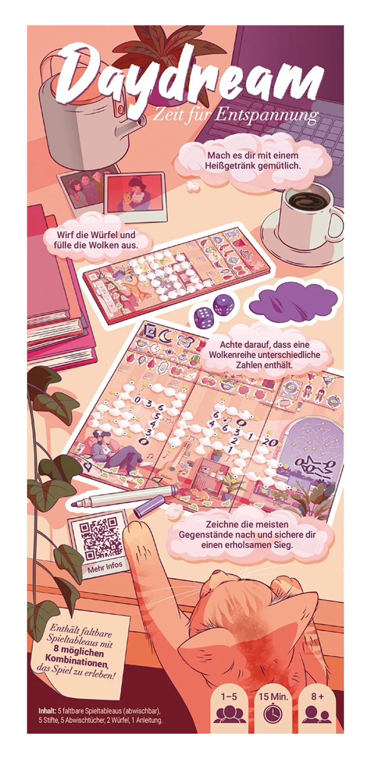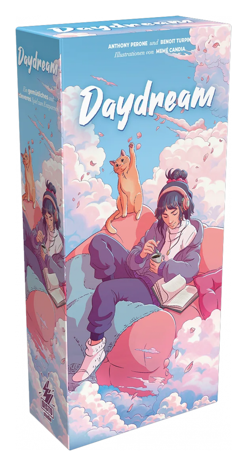 Im gemütlichen „Roll & Write“-Familienspiel Daydream tragt ihr nach jedem Würfelwurf Zahlen in ein Wolkenraster ein, wobei ihr versucht, innerhalb einer Wolkenreihe (waagerecht oder senkrecht) nur unterschiedliche Zahlen einzutragen.