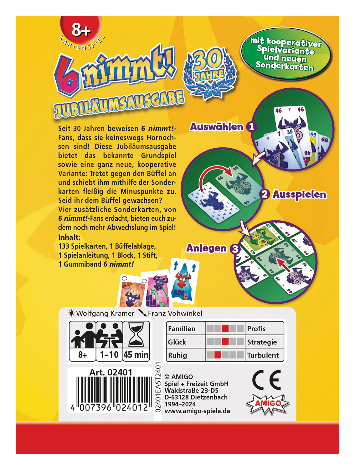 Seit 30 Jahren beweisen 6 nimmt!- Fans, dass sie keineswegs Hornochsen sind! Diese Jubiläumsausgabe bietet das bekannte Grundspiel sowie eine ganz neue, kooperative Variante. Dabei treten die Spielenden gemeinsam gegen den Büffel an und schieben ihm mithilfe der Sonderkarten fleißig die Minuspunkte zu.