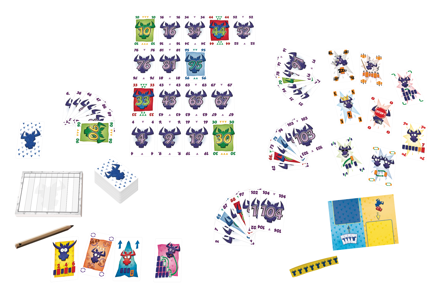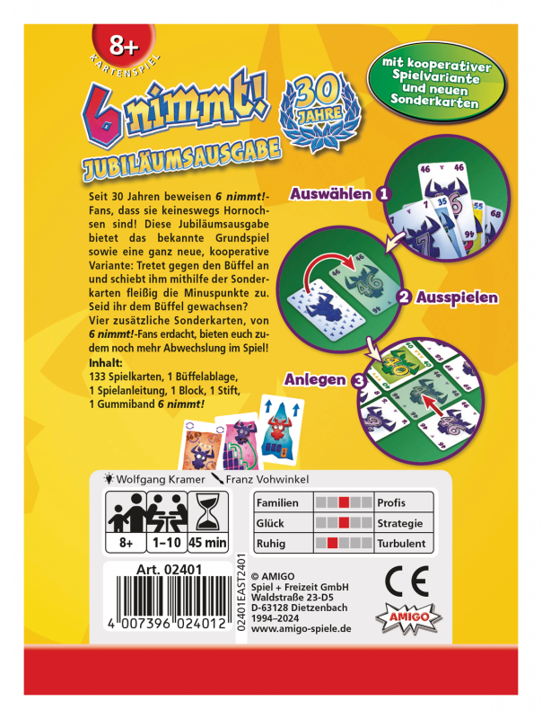 * Fan-Sonderkarten: Vier zusätzliche Sonderkarten, erdacht von 6 nimmt!-Fans, bringen noch mehr Abwechslung ins Spielvergnügen.