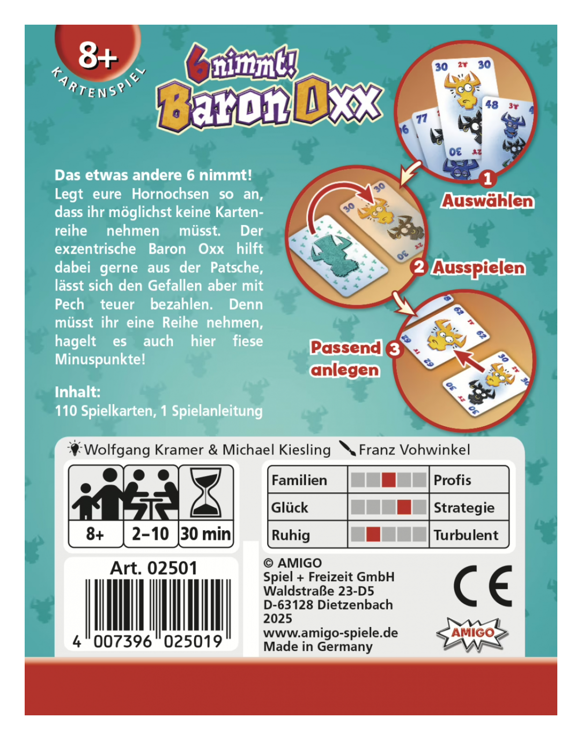 Farbige Hornochsen statt Zahlen werden in dieser launigen Variante des beliebten Klassikers passend an die Kartenreihen gelegt. Sind sechs Karten oder mindestens sechs Hornochsen einer Farbe in einer Reihe erreicht, kassiert man auch hier fiese Minuspunkte. Der exzentrische Baron Oxx hilft dabei zwar gerne aus der Patsche, lässt sich den Gefallen aber mit Pech durch viele Minuspunkte bezahlen.