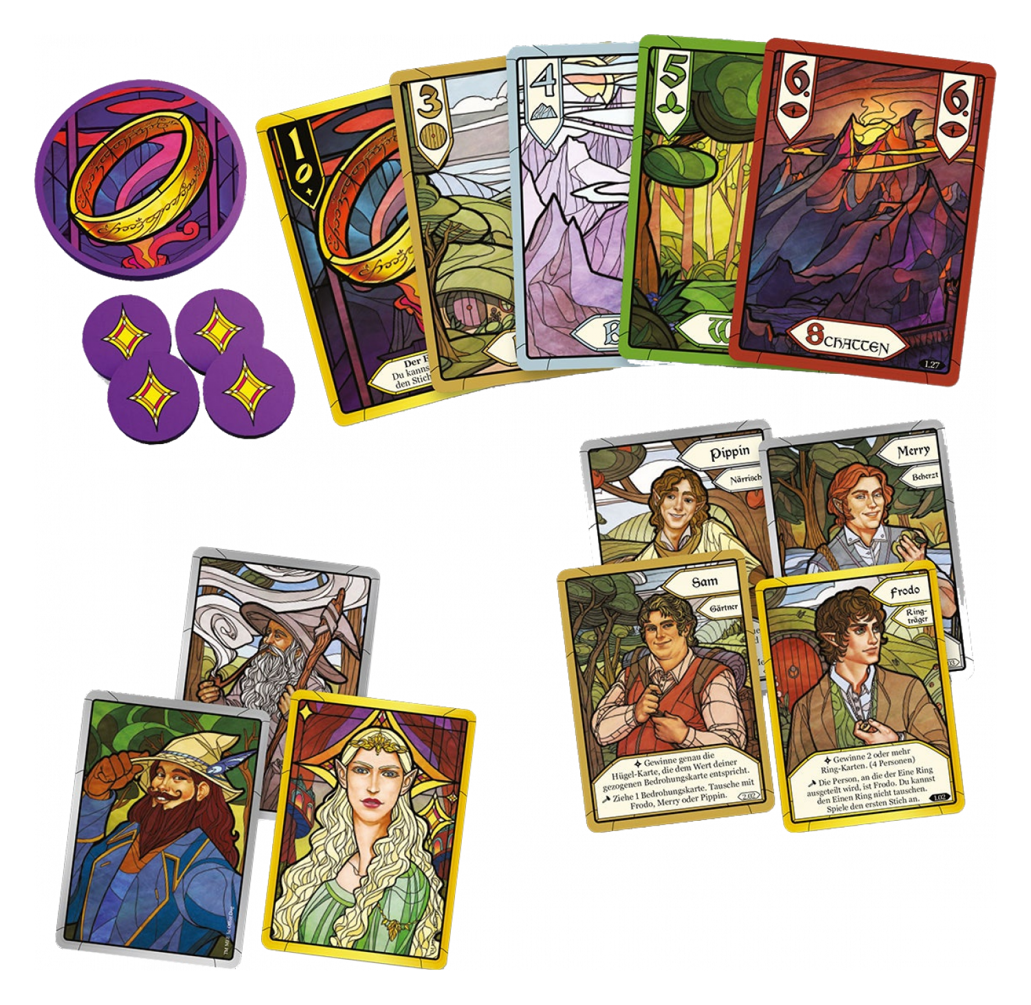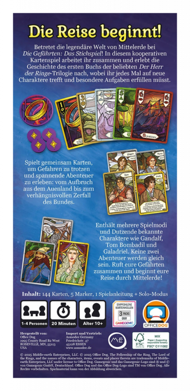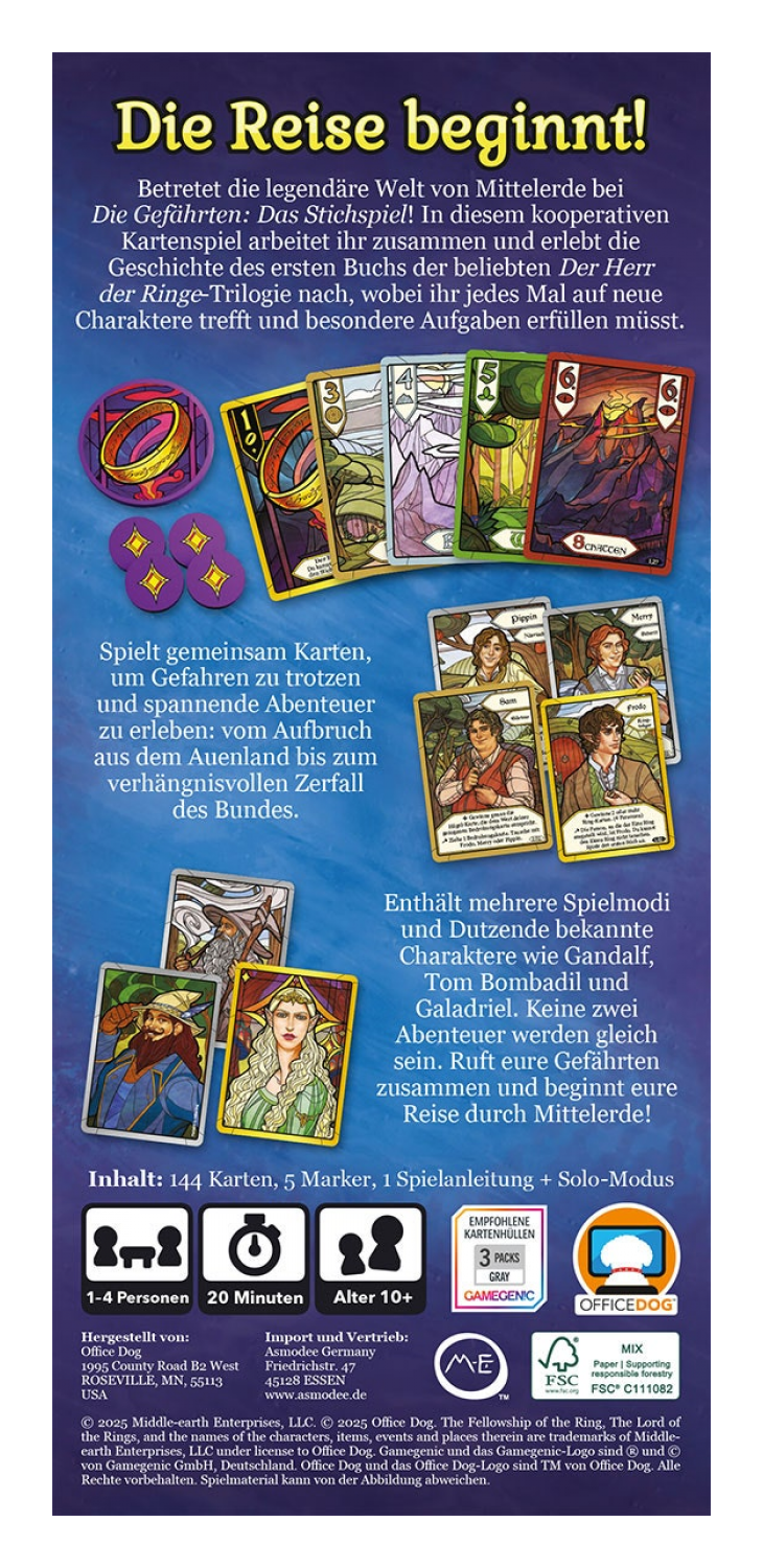 Der Herr der Ringe: Die Gefährten – Das Stichspiel ist ein kooperatives Kartenspiel für 1 bis 4 Personen, das euch in 18 Kapiteln durch den ersten Teil von J. R. R. Tolkiens klassischer Roman-Trilogie Der Herr der Ringe begleitet. Spielt gemeinsam Karten, um Gefahren zu trotzen und spannende Abenteuer zu erleben: vom Aufbruch aus dem Auenland bis zum verhängnisvollen Zerfall des Bundes.