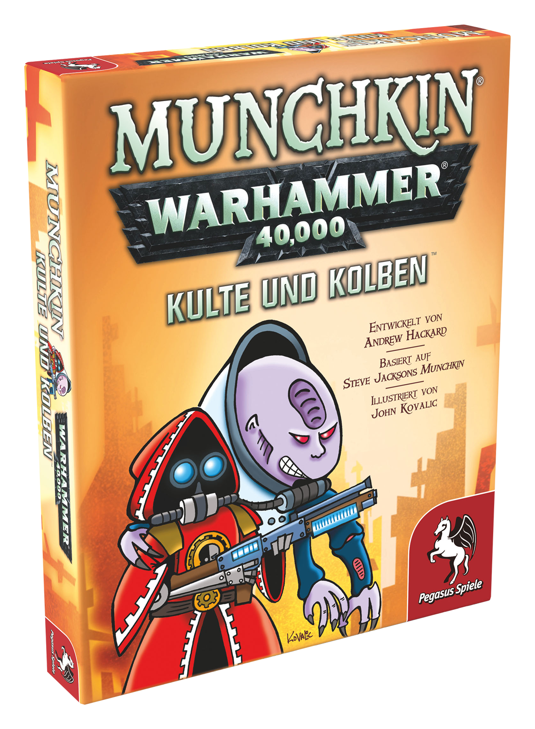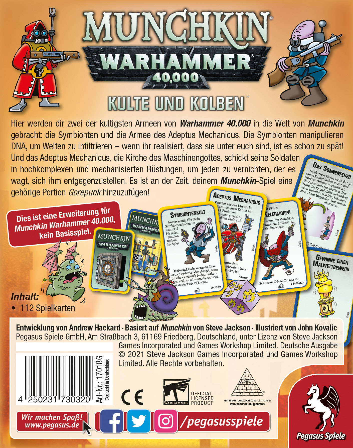 Mit der Kulte und Kolben-Erweiterung für Munchkin Warhammer 40.000 kommen zwei der kultigsten Armeen in die Welt von Munchkin: die Symbionten und die Armee des Adeptus Mechanicus. Die Symbionten manipulieren DNA, um Welten zu infiltrieren - wenn ihr realisiert, dass sie unter euch sind, ist es schon zu spät! Und das Adeptus Mechanicus, die Kirche des Maschinengottes, schickt seine Soldaten in hochkomplexen und mechanisierten Rüstungen, um jeden zu vernichten, der es wagt, sich ihm entgegenzsutellen. Es ist an der Zeit, deinem Munchkin-Spiel eine gehörige Portion Gorepunkt hinzuzufügen!