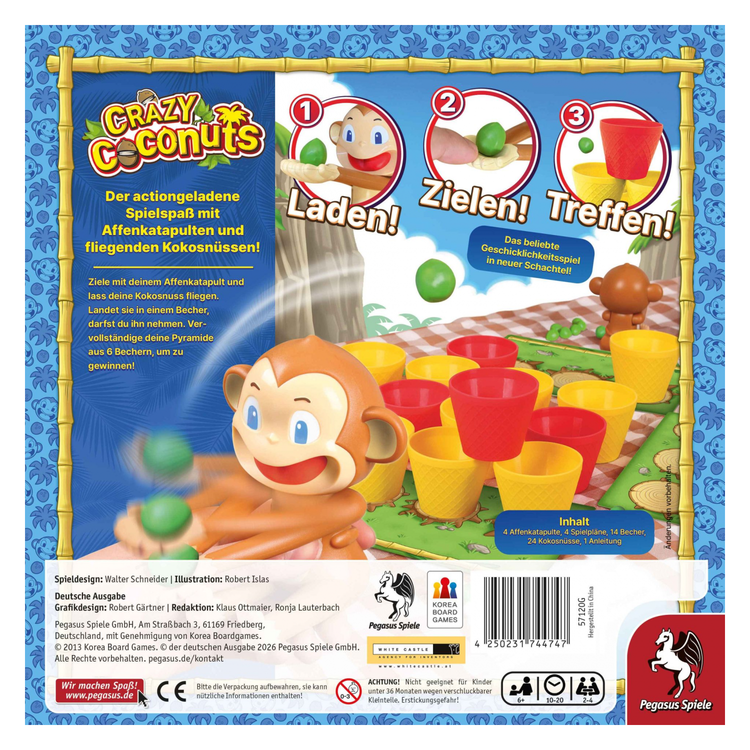 Auf der Affeninsel steht der alljährliche Crazy Coconuts Wettkampf an! Es gewinnt der Affe, der die Kokosnüsse am geschicktesten über seinen Kopf in die Körbe in der Mitte schleudern kann. Dafür zielen die Spielenden mit ihren Affenkatapulten auf Becher und versuchen, diese mit Kokosnüssen zu treffen. Wer dabei einen roten Becher trifft, ist sogar gleich nochmal dran. Wer zuerst eine Becherpyramide vor sich aufgebaut hat, gewinnt.