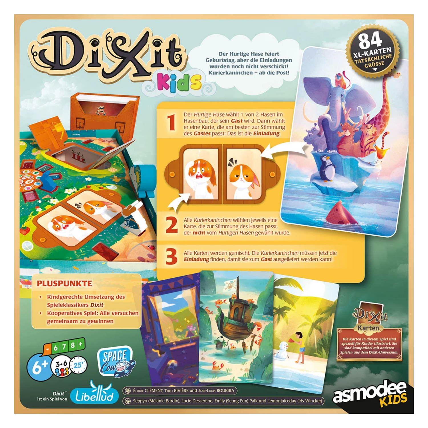 Dixit Kids überträgt das Spielprinzip seines großen Bruders perfekt in eine kindgerechte Version. Die 84 neuen, speziell für Kinder illustrierten Karten, sind mit allen weiteren Spielen aus dem Dixit-Universum kompatibel.
