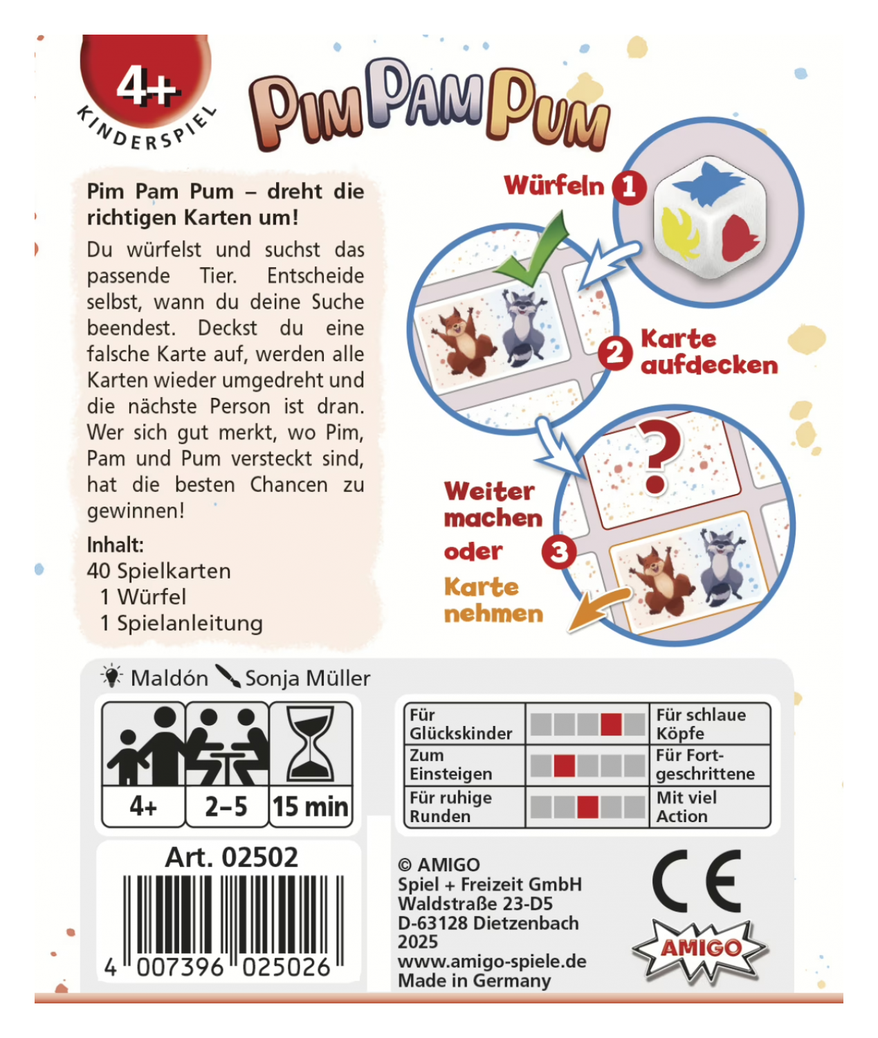 Die Spielenden würfeln und suchen das passende Tier, bis sie die Suche freiwillig beenden. Decken sie eine falsche Karte auf, werden alle Karten wieder umgedreht und die nächste Person ist dran. Wer sich gut merkt, wo Pim, Pam und Pum versteckt sind, hat die besten Chancen zu gewinnen! Ein liebevoll gestaltetes Kinderspiel mit Memo-Mechanik.