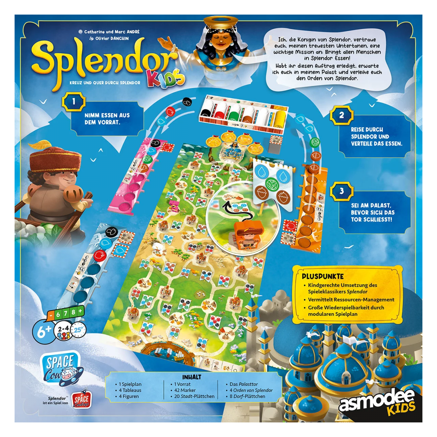 Wählt euren Weg durch das Königreich möglichst geschickt, denn nur wer am Palast von Splendor ankommt, bevor sich die Tore schließen, gewinnt die Gunst der Königin und damit das Spiel!