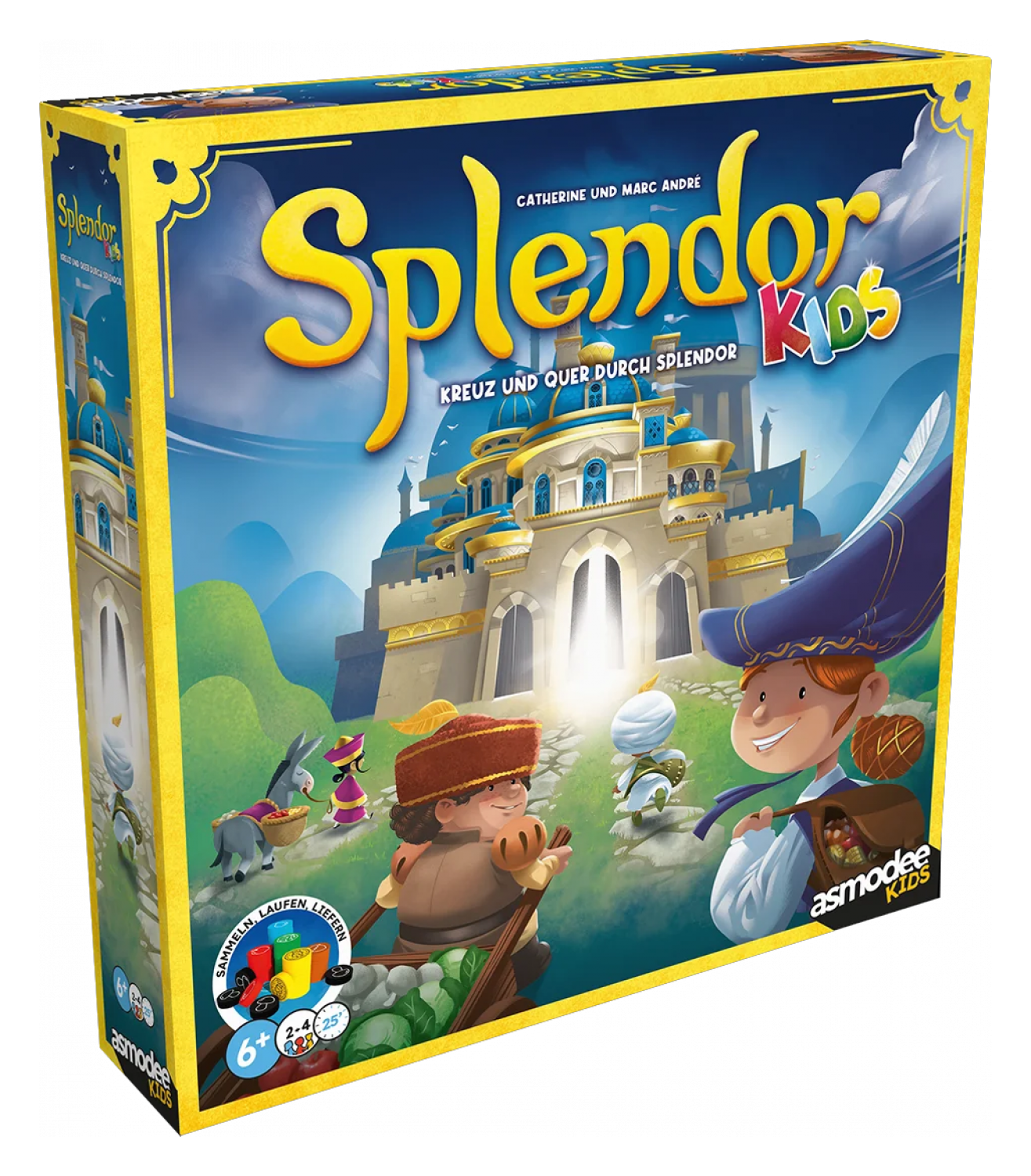 Im spannenden Kinderspiel Splendor Kids tretet ihr gegeneinander in einem Wettlauf an, um Essen im Königreich von Splendor zu verteilen. Besucht Dörfer und Städte und verteilt dort Nüsse, Äpfel und Wasser, um die Bewohner zufriedenzustellen.