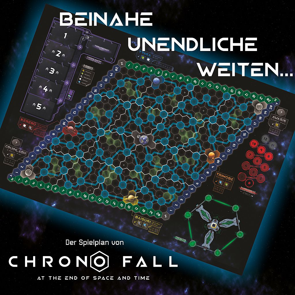 Fliegt mit euren Raumschiffen über ein riesiges Hexagon-Koordinatensystem, sammelt dabei Wissen und steigert gezielt eure Fähigkeiten. Schaut mit der einzigartigen Chrono-Matrix in die Zukunft und versucht, die schlimmsten Katastrophen durch Manipulation der Zeit zu verhindern. Haltet die Hyperraumtunnel für die Flotte der Frachter frei, damit der Ressourcennachschub von den Exoplaneten zur Erde gesichert bleibt. Nur, wenn ihr eure individuellen Fähigkeiten optimal koordiniert, werdet ihr den verschiedenen Herausforderungen gewachsen sein. Die größte Bedrohung sind die allgegenwärtigen Rifts, Brüche im Raum-Zeit-Kontinuum, deren Ausbreitung ihr dringend eindämmen müsst. Sie bringen dem Universum das Ende von Vergangenheit, Gegenwart und Zukunft – den Chrono Fall!