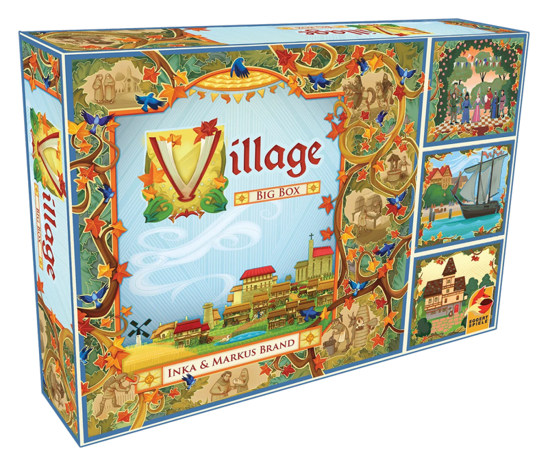 Die Village Big Box enthält alle bisherigen Erweiterungen, alle Promos und eine komplett neue Erweiterung. Außerdem gibt es einen neuen Solo-Modus, ein neues Design und viele aufgewertete Spielelemente.
