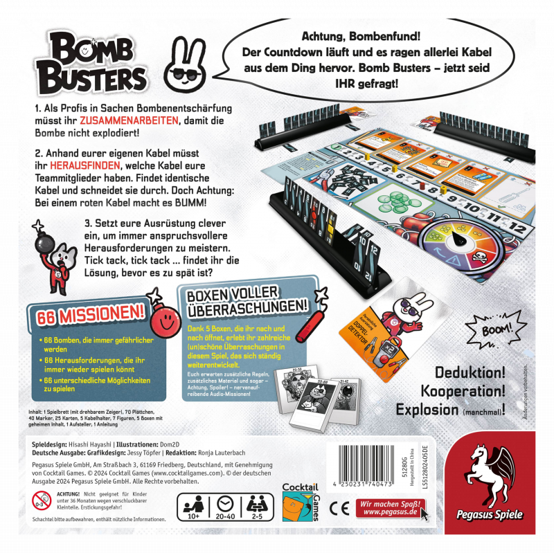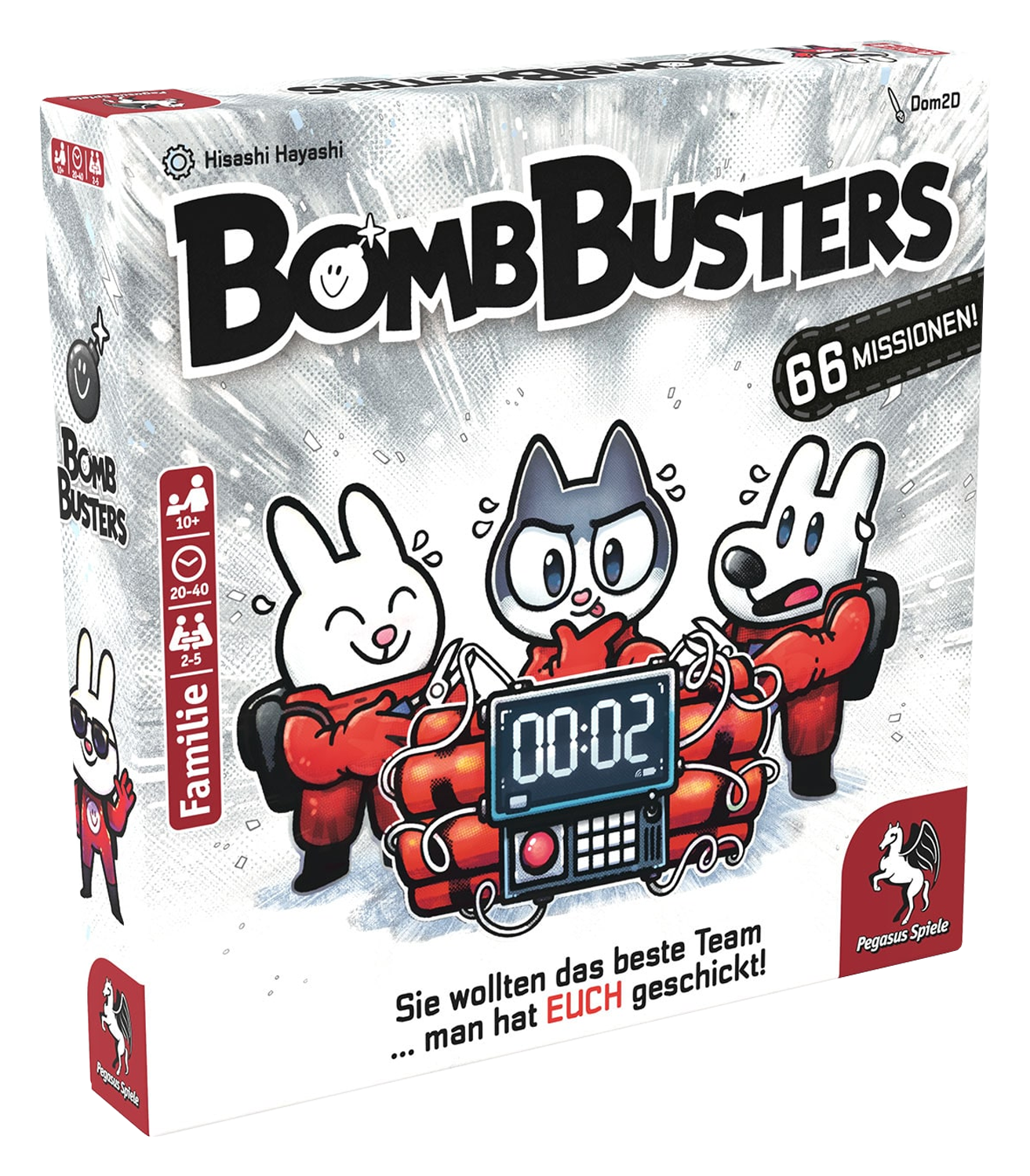 Bomb Busters ist ein kooperatives Deduktionsspiel mit 66 immer gefährlicher werdenden Missionen und inklusive fünf Überraschungs-Boxen mit zusätzlichen Regeln und Materialien. Durchtrennt werden die Kabel dabei nur im übertragenen Sinn, Spielmaterialien werden nicht zerstört.
