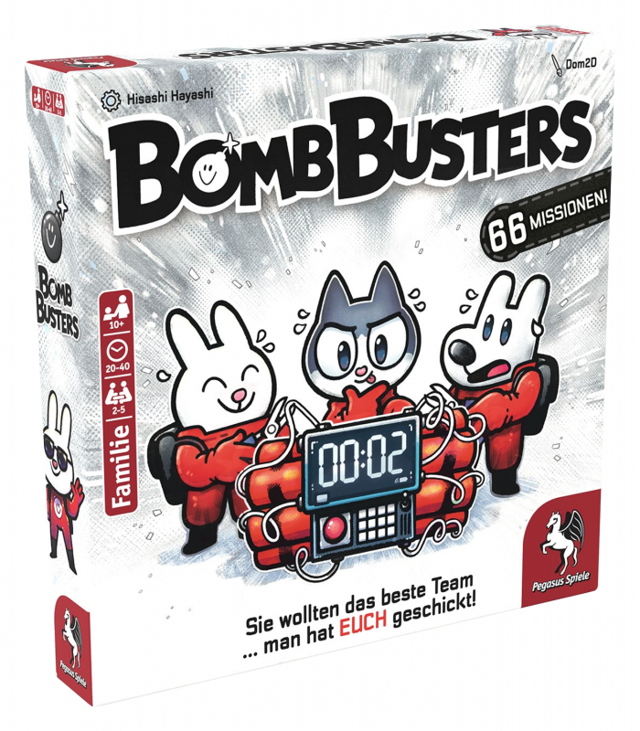 Als angehende Bombenentschärfungs-Profis müssen die Spielenden in Bomb Busters als Team zusammenarbeiten, damit die Bombe nicht explodiert! Um ihre Mission erfolgreich auszuführen, müssen sie identische Kabel durchtrennen – einen Teil haben sie direkt vor sich, doch wer ein Kabel mit identischem Wert hat, müssen sie nach und nach herausfinden. Die Info, dass jede Nummer von 1 bis 12 genau vier Mal im Spiel ist, hilft dabei ebenso wie die Sortierung der Kabel jedes Teammitglieds in numerischer Reihenfolge. Zwei durchtrennte Kabel mit identischer Zahl bringen sie einen Schritt näher in Richtung Bombenentschärfung. Durchtrennen sie jedoch Kabel mit unterschiedlichen Werten, rückt die Explosion der Bombe näher. Beim Schnitt eines roten Kabels kracht es sofort und das Spiel endet. Gelbe Kabel mit Dezimalzahlen bringen zusätzliche Herausforderung ins Spiel und Ausrüstungskarten helfen bei besonders kniffligen Missionen.