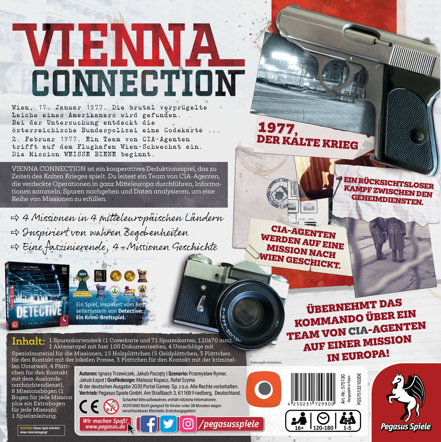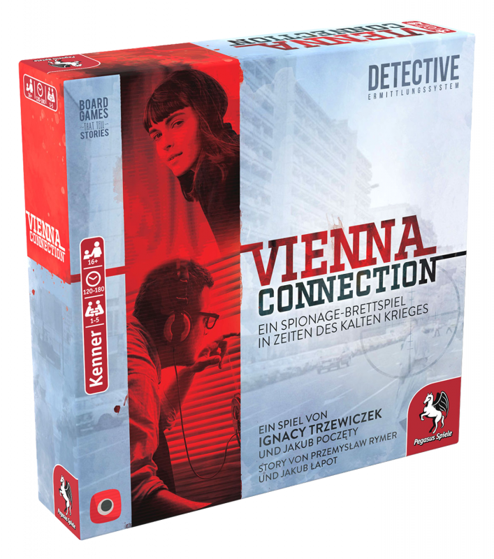 Vienna Connection wurde inspiriert von wahren Begebenheiten und basiert auf dem Investigationssystem von Detective - Ein Krimi-Brettspiel. Statt mit der digitalen Antares-Datenbank findet die Detektivarbeit jedoch stilecht analog statt. Den Spielern steht dazu ein Aktenstapel mit fast 100 Dokumentseiten zur Verfügung. Die faszinierende Geschichte führt das CIA-Team im Verlauf von vier Mission in vier mitteleuropäische Länder.