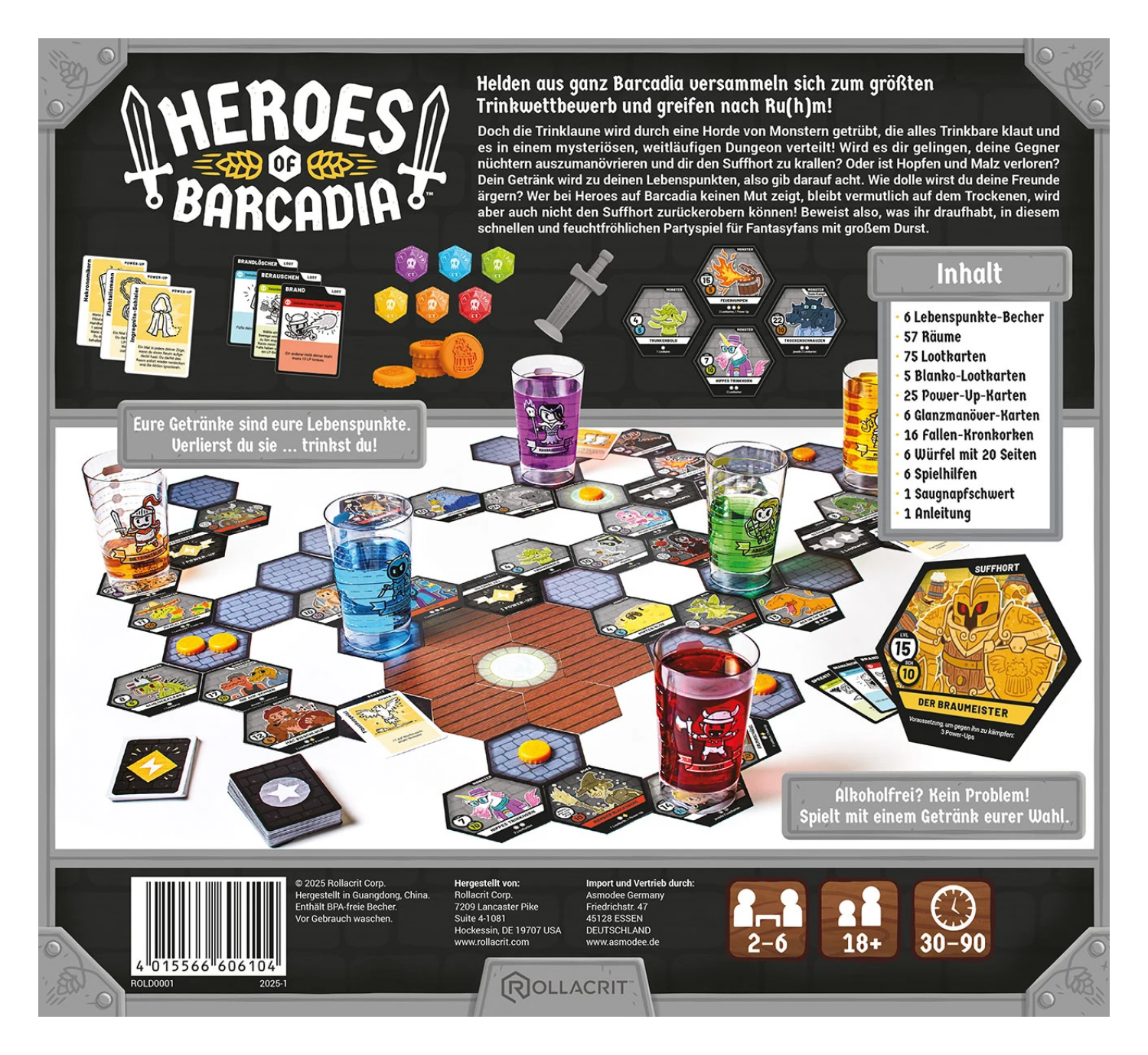 Heroes of Barcadia ist ein Partyspiel für Erwachsene, bei dem ihr als tollkühne Helden zu einem Trinkwettbewerb antretet und nach dem meisten Ru(h)m greift. Eure Trinklaune wird dabei allerdings von einer Horde Monster getrübt, die ihr im variabel aufgebauten Dungeon bekämpfen müsst. Eure Becher (mit Inhalt eurer Wahl) stellen hierbei eure Heldenfiguren und ihre Lebenspunkte dar. Wenn ihr welche verliert, müsst ihr trinken! Dabei solltet ihr euren Mitstreitern nicht zu sehr vertrauen, denn sie werden die erste Chance nutzen, euch tief ins Glas schauen zu lassen. Beweist, was ihr draufhabt, und findet den „Suffhort“ bevor es die anderen tun, in diesem schnellen und feuchtfröhlichen Partyspiel für Fantasyfans mit großem Durst.