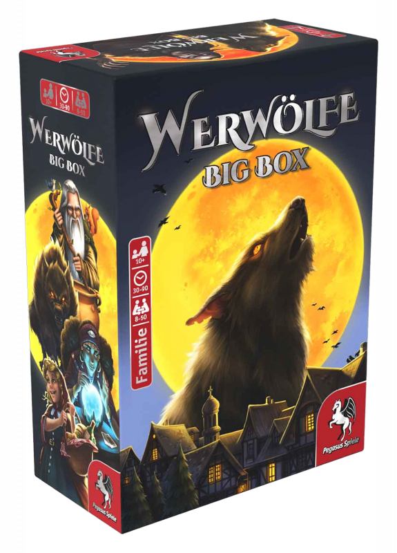 Die Werwölfe Big Box beinhaltet zum einen den Klassiker unter den Kommunikationsspielen für große Gruppen, Werwölfe, und zum anderen das unabhängig oder kombiniert spielbare Werwölfe – Vampirnacht. Mit der Werwölfe Big Box können so nun bis zu 50 Personen zusammenspielen. Darüber hinaus liegen der limitierten Ausgabe auch die beiden bisher erschienen Promokarten Streunende Katze und Wachhund sowie Notizblock und Bleistift bei.