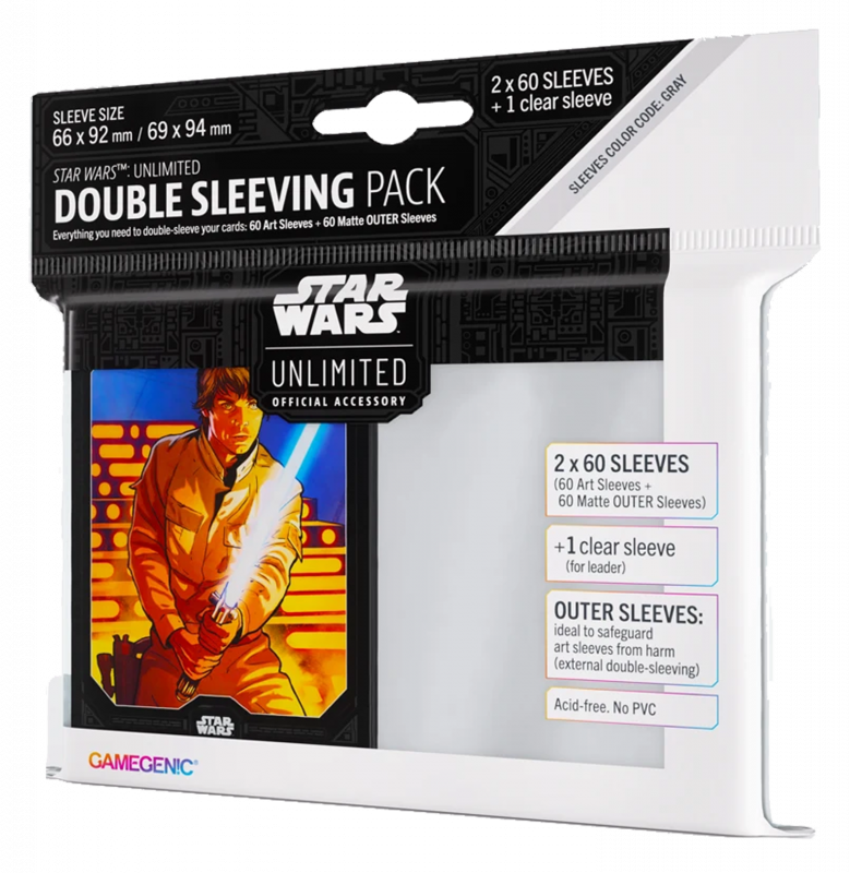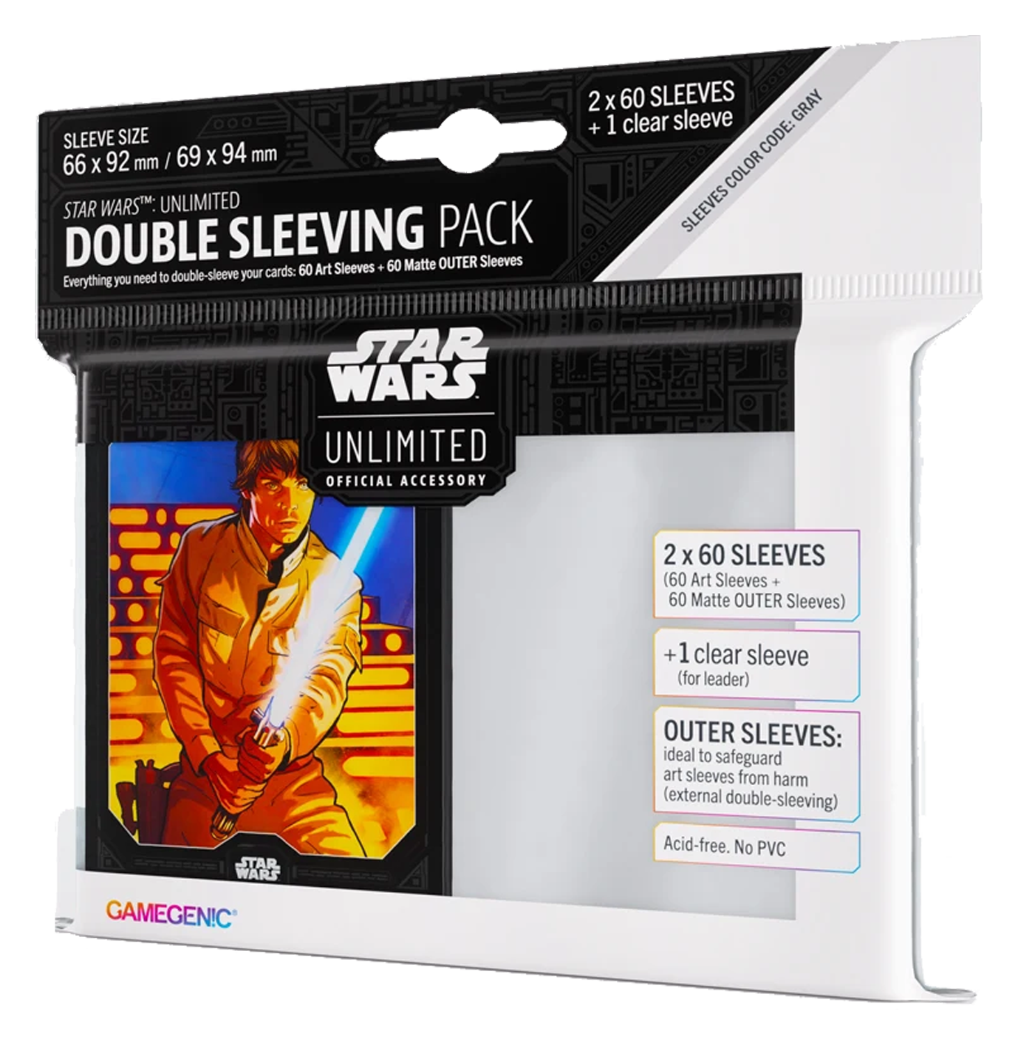 Das Star Wars™: Unlimited Double Sleeving Pack enthält sowohl die fantastischen Master Art Sleeves als auch die Matte Outer Sleeves zum Schutz eines kompletten Decks mit bis zu 60 Spielkarten in Standardgröße. Die Master Art Sleeves bieten ein unglaublich gutes Gefühl beim Mischen.