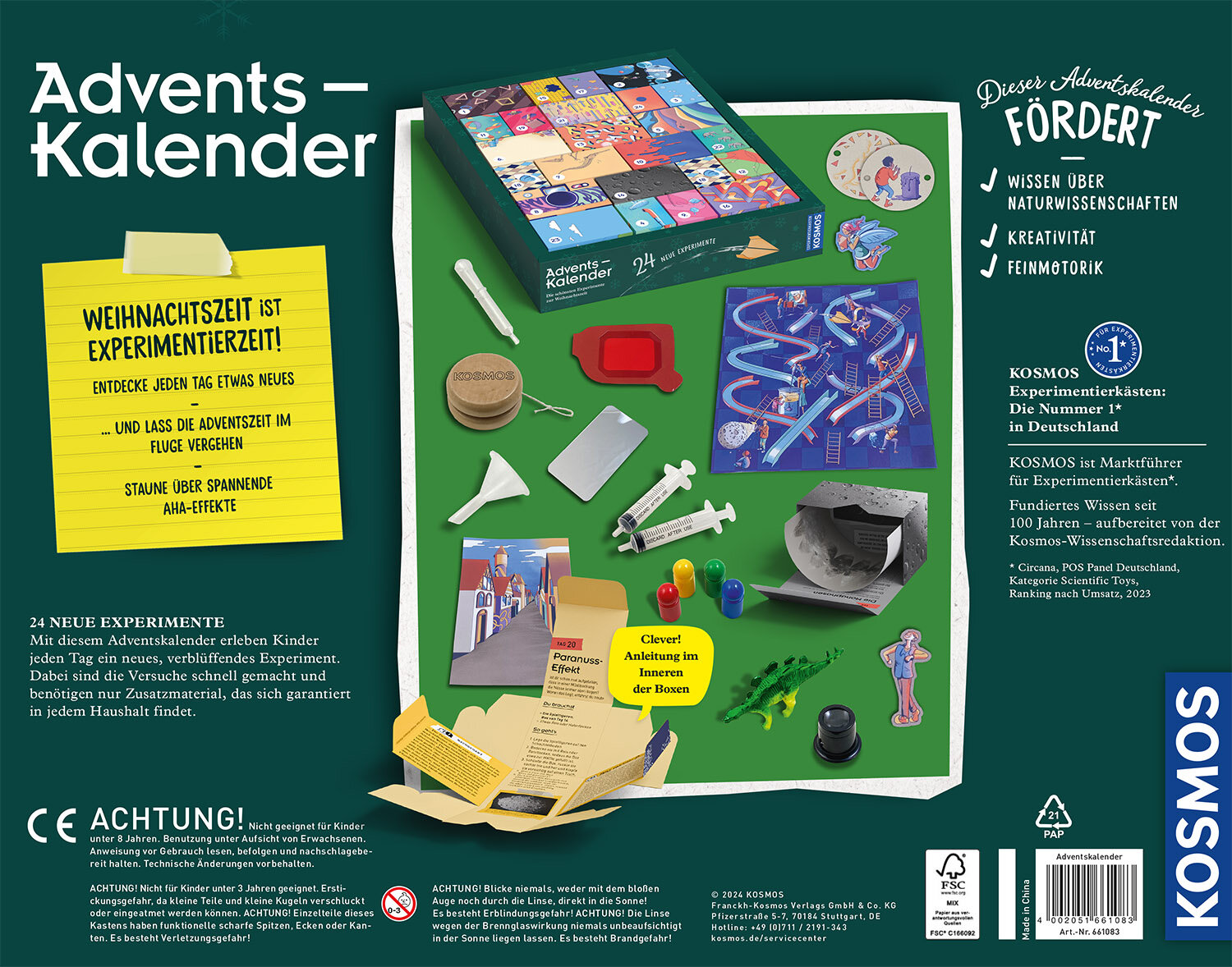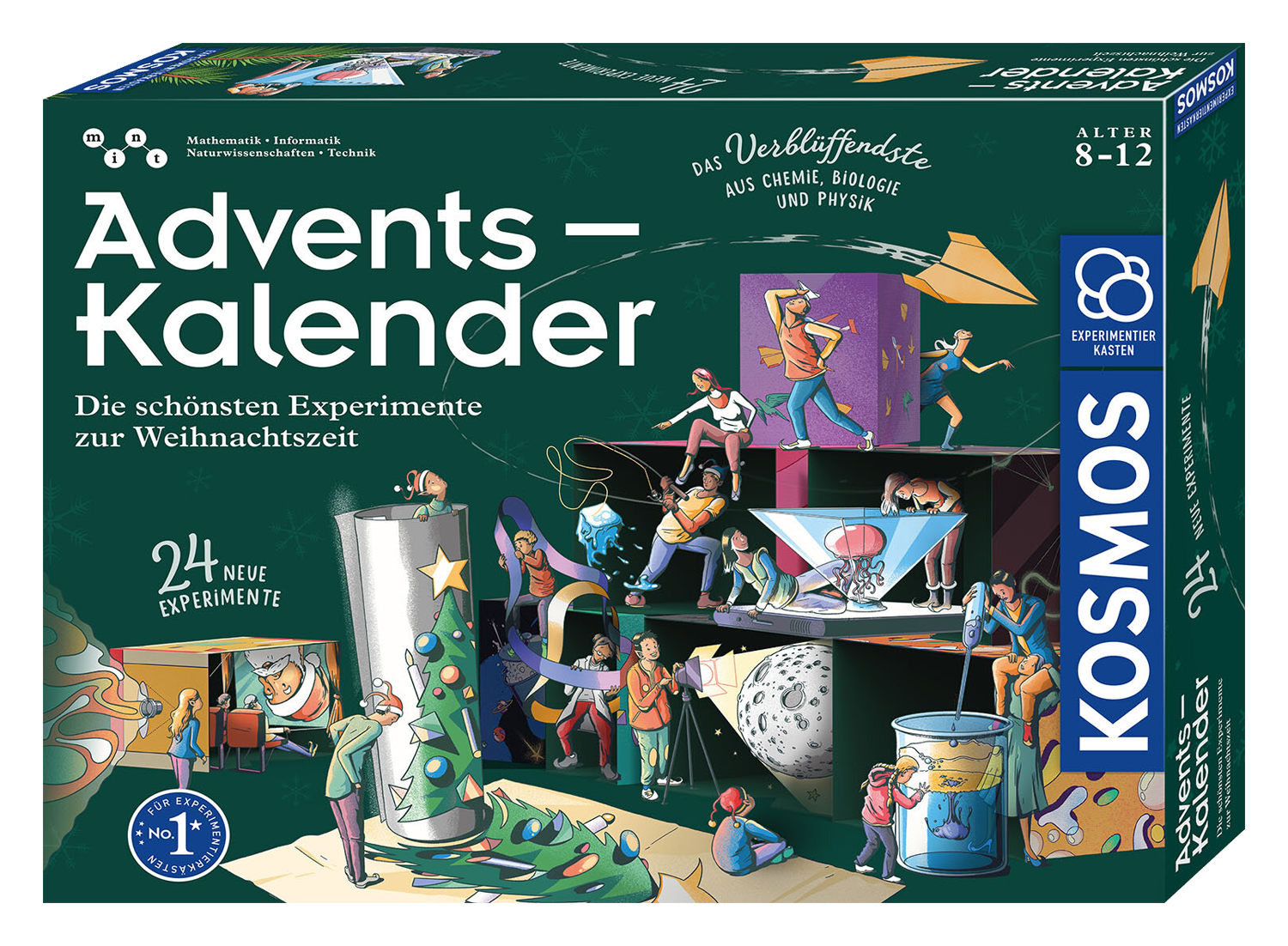 Hier warten neue Durchstarter-Experimente auf neugierige Kinder – der Adventskalender mit Wissenskick für die Weihnachtszeit 2024! Alle 24 Versuche sind innerhalb von wenigen Minuten durchgeführt und damit der perfekte Start in den Tag. Physik, Biologie und Chemie zum Anfassen - da staunt die ganze Familie über Alltags-Phänomene! Einfach jeden Morgen eine der kleinen Schachteln öffnen und verblüffen lassen, wohin sie führt! Haben die Versuche neugierig gemacht? Dann verraten Zusatzinfos noch viel mehr über die spannenden Effekte und liefern tolles Hintergrundwissen.