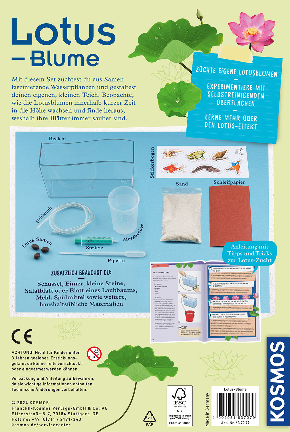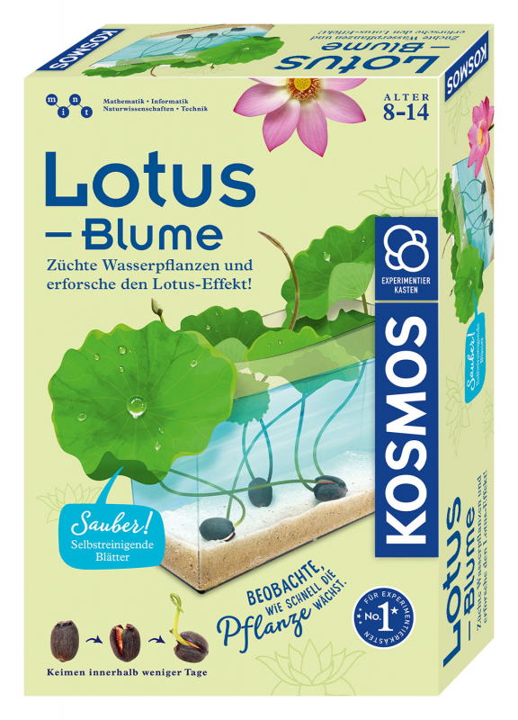 Wasserpflanzen züchten und den Lotus-Effekt entdecken! Mit diesem einzigartigen Anzuchtset von KOSMOS beobachten Kinder durch das transparente Becken, wie die ersten Keimlinge aus den Samen der Lotus-Blume sprießen. Schon nach kurzer Zeit erreichen die wachsartigen Blätter die Wasseroberfläche und sind bereit für die ersten Experimente zum Selbstreinigungseffekt. Mit viel Spaß, Kreativität und zahlreichen Utensilien erschaffen die Kinder ihre eigene Wasserpflanzen-Welt, altersgerecht angeleitet durch das farbig illustrierte Begleitheft. Ein denkbar leichter Einstieg in die Welt der Pflanzen, mit schnellen Zuchterfolgen und faszinierenden Effekten. Für Kinder ab acht Jahren.