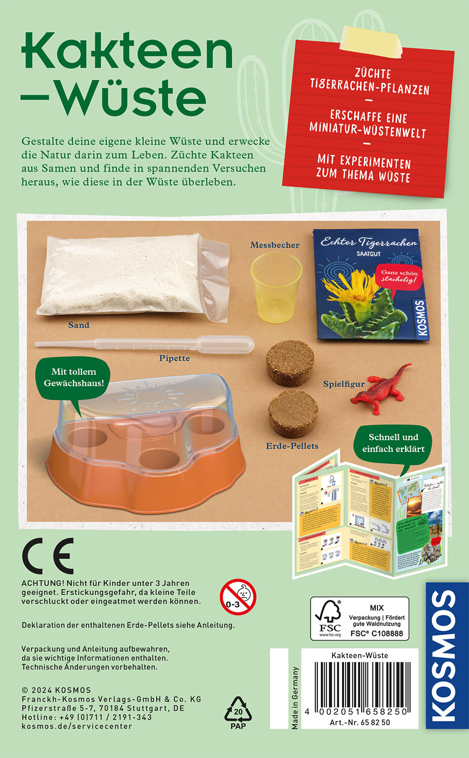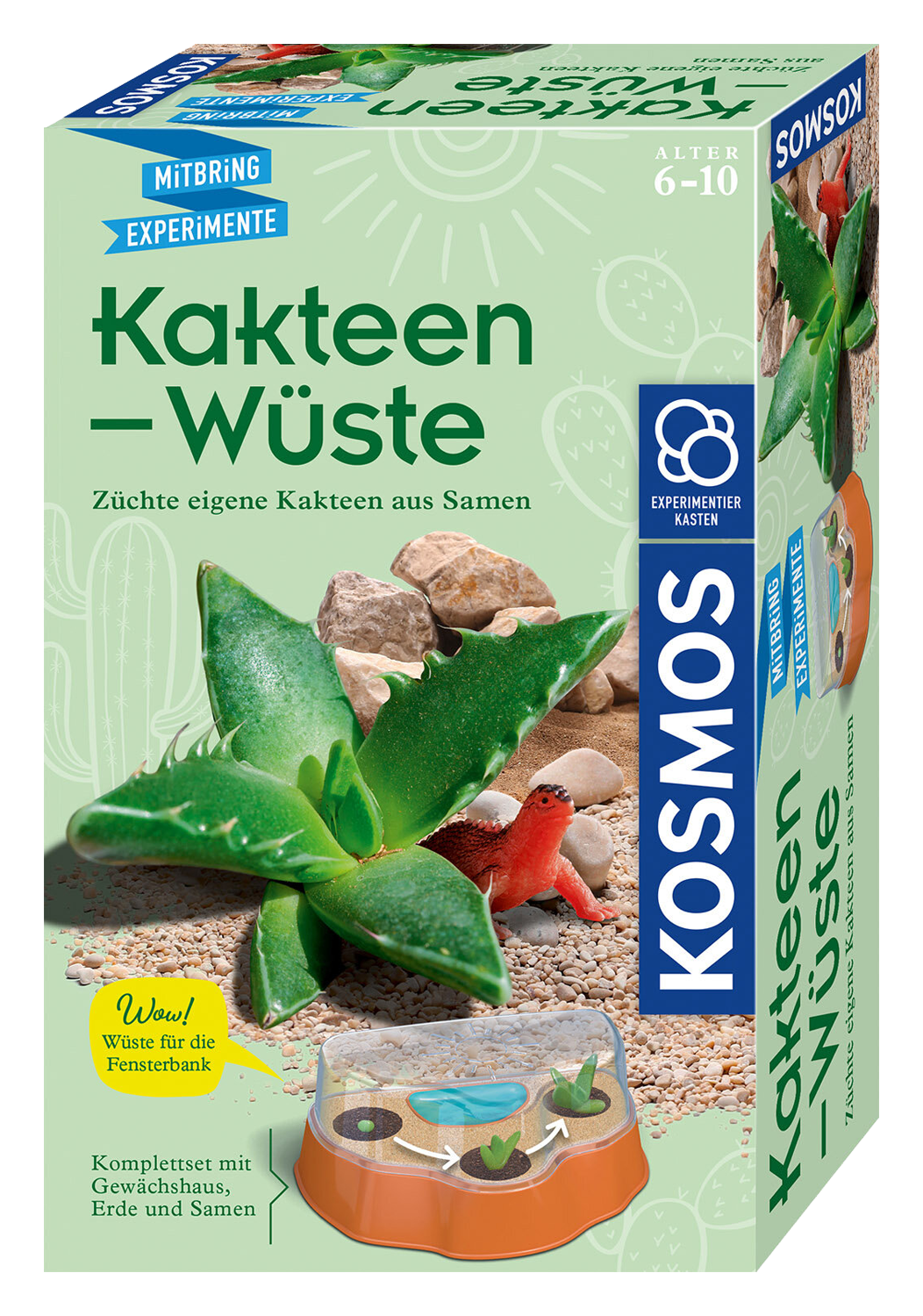 Das KOSMOS Experimentierset enthält Pflanzensamen, ein Gewächshaus, Erde, Sand und eine Echsen-Spielfigur, mit der noch mehr Wüsten-Flair aufkommt. Mit tollen Experimenten zu Tau und Verdunstung und spannendem Wissen über Wüsten und Kakteen.
