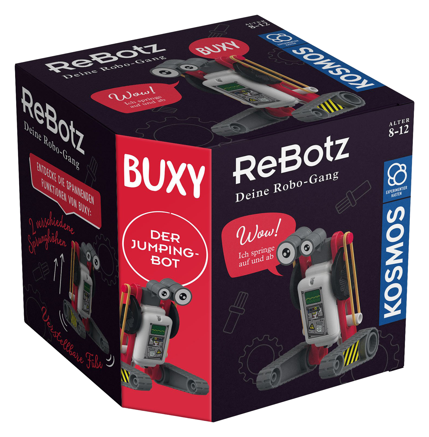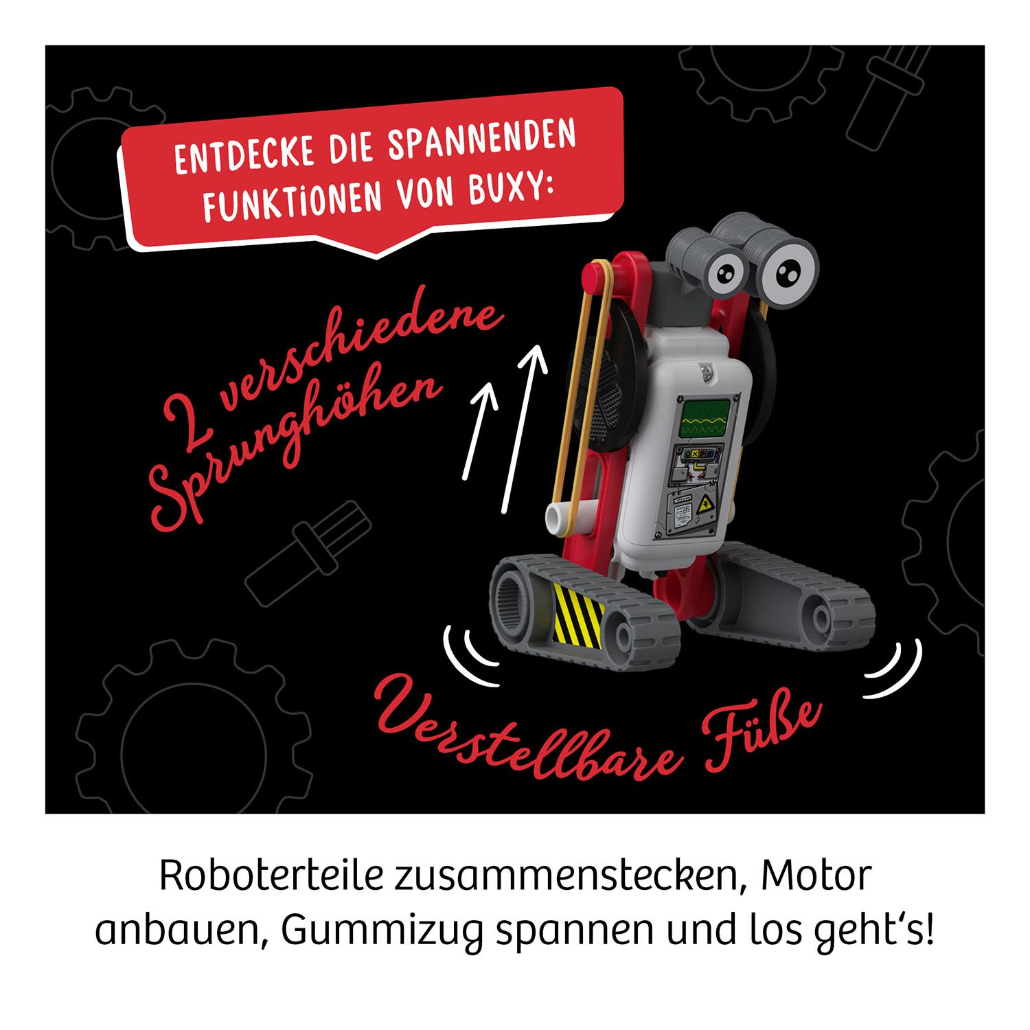 Verrückt, wie dieser kleine Roboter wild durchs Zimmer springt und alle mit seinen waghalsigen Kunststücken überrascht! Mit einem Gummizug und einem Motor ausgestattet, ist der wilde Buxy gar nicht zu stoppen! Schnell klicken Kinder von 8 bis 12 Jahren die Einzelteile zusammen, setzen den Motor ein und legen die Batterien ins Fach – die übersichtliche Anleitung verrät wie. Mit den verschiedenen Sprunghöhen sind witzige Experimente möglich!