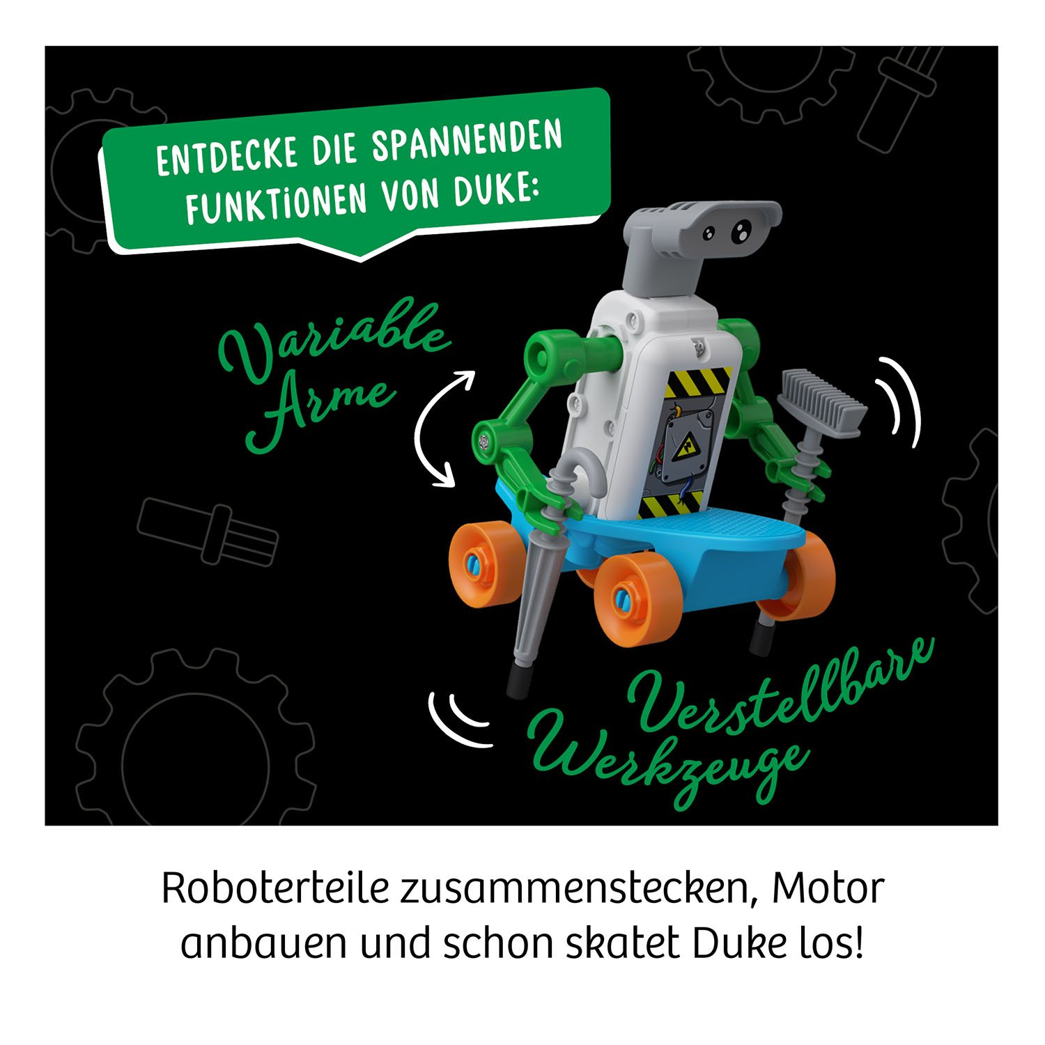 Aus der Bahn, hier kommt der coole Skater! Aus wenigen Einzelteilen und mit schnellen Klicks bauen Kinder ab 8 Jahren einen rollenden Roboter von KOSMOS zusammen. Schon düst er wild durchs Zimmer. Mit Schirm, Besen und Skateboard ausgestattet, ist bereits das Äußere des ReBotz etwas ganz Besonderes. Einfach der anschaulichen Anleitung folgen, Motor und Batterien einbauen und schon setzt sich der Roboter in Bewegung. Mit den variablen Armen wird jedes Mal neu bestimmt, wie Duke drauflos skatet.